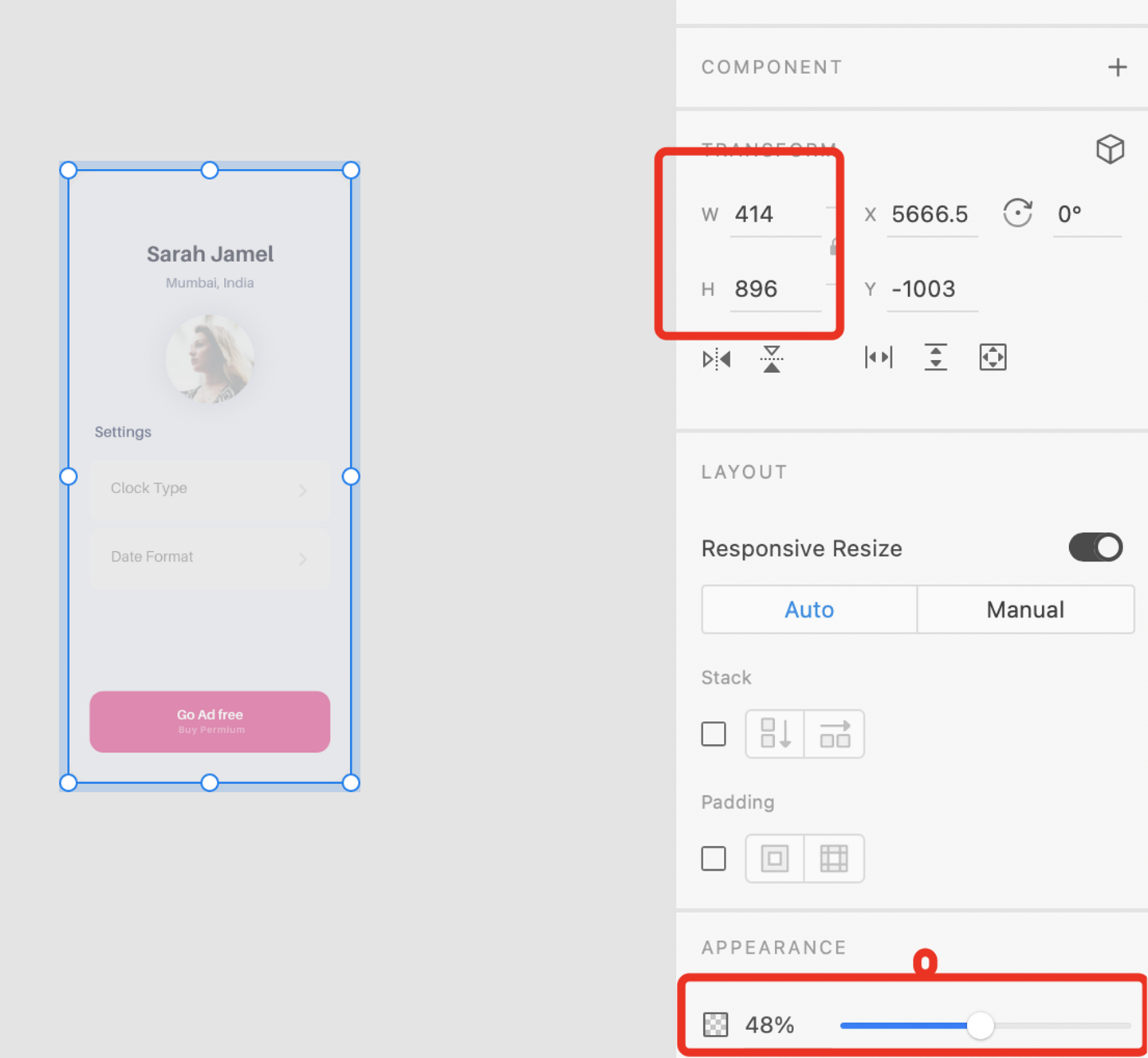 インポートした画像は初期状態では高さ(height)のみが反映されていることがありますので、幅(width)と高さ(height)を手動で調整し、デザインと同じサイズ(414 × 896)に揃える必要があります。 - その後、[appearance(外観)] の不透明度を約40〜50%に調整します。