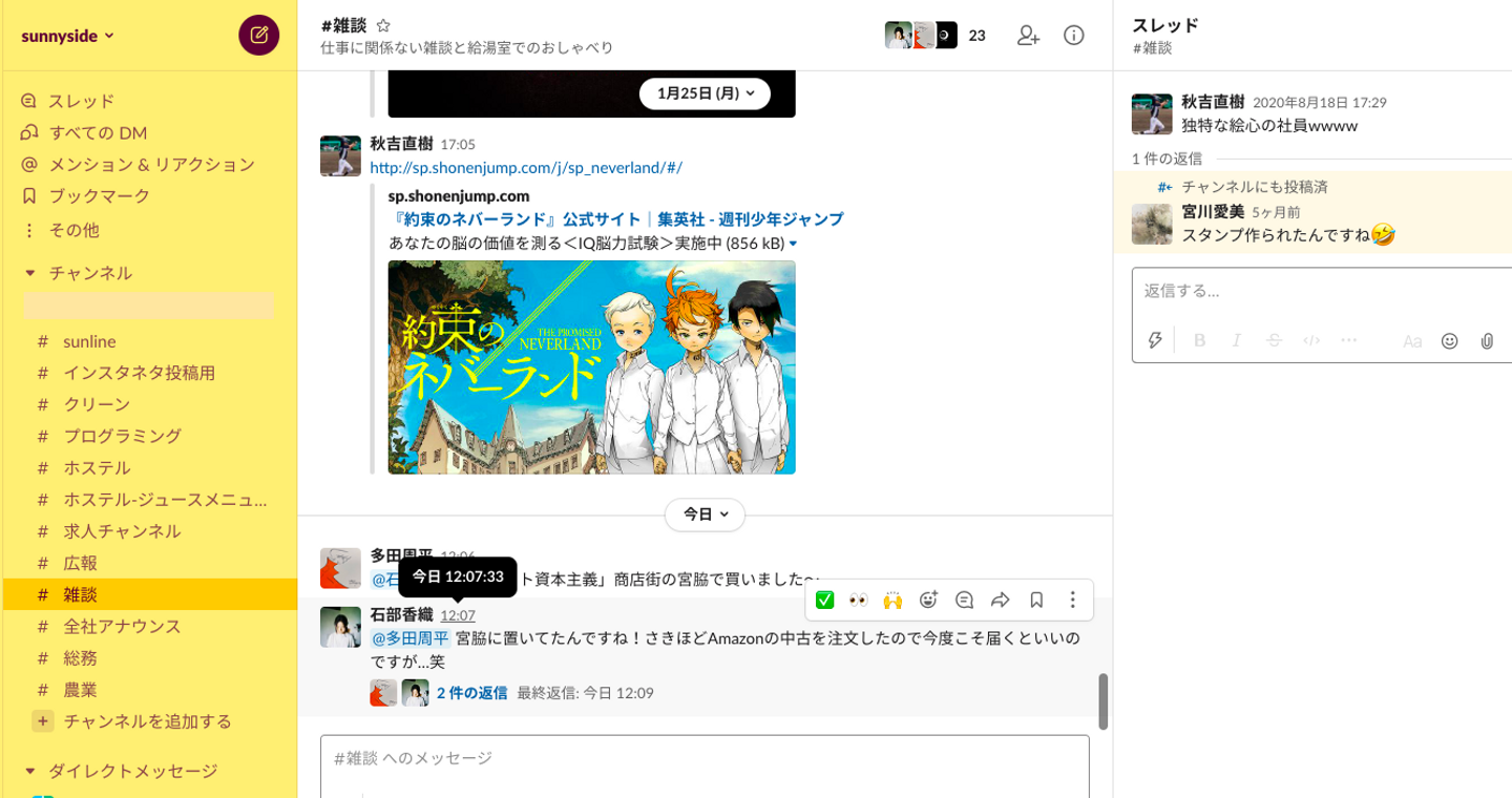 ↑実際のチャンネルリスト。雑談チャンネルでは、ときおり映画や漫画の話題が盛り上がります。