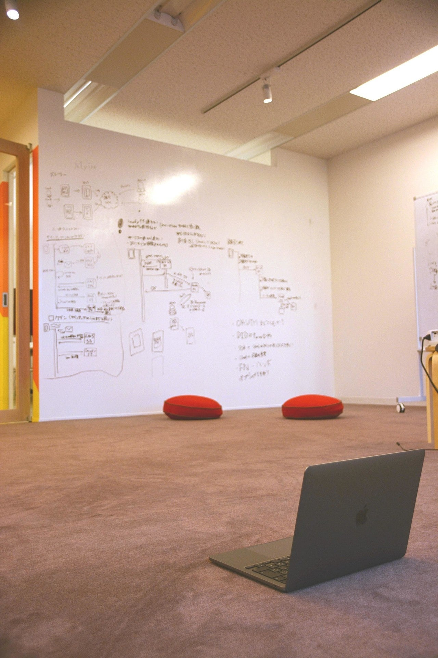ホワイトボードを可能な限り大きいサイズで用意し、リモートとオフラインを交えた働き方が行いやすいよう、マイクやスピーカーの設備も拡充させています。