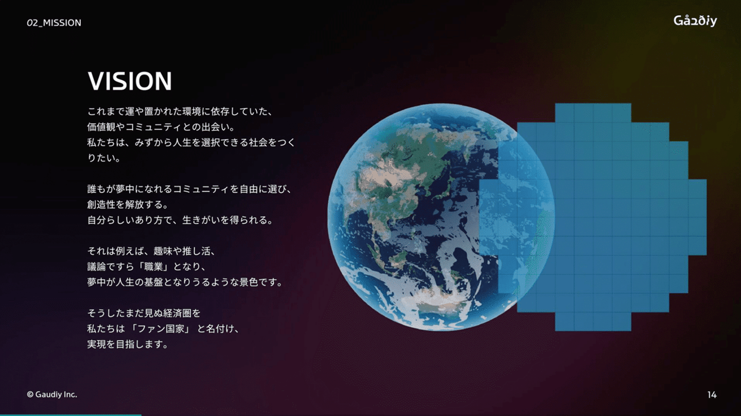 僕らが目指す世界は、「ファン国家」という、国や人種、年齢問わず、すべての人々が "好き" や "夢中" で生活できるような社会の実現です。それを阻害する「資本主義」や「歪んだ情報社会」を、Web3、LLM、エンタメの力を使って解決しようとしています。戦略の絵は、ほぼ完璧に描けています。