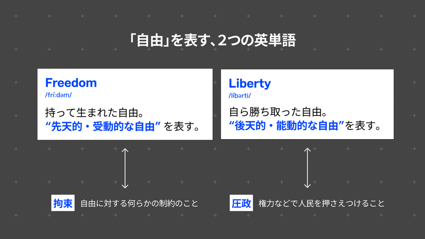 具体的には、「Freedom」は「肉体的・精神的に制約を受けていない状態」を意味し、対する「Liberty」は、自由の女神(Statue of Liberty)のように「抑圧から解放されて手に入れた自由」を意味する。
