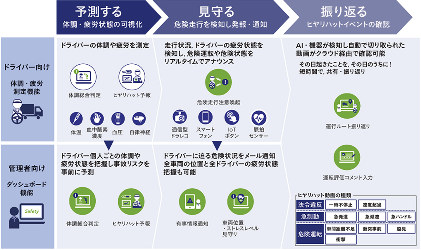 具体的には、トラックやバスを運転するドライバーのバイタル情報、ドライブレコーダー情報、走行データ、位置情報を集約し、このデータから危険を予測。管理者は遠隔からリアルタイムで状況を確認でき、安全に役立てていただく機能です。