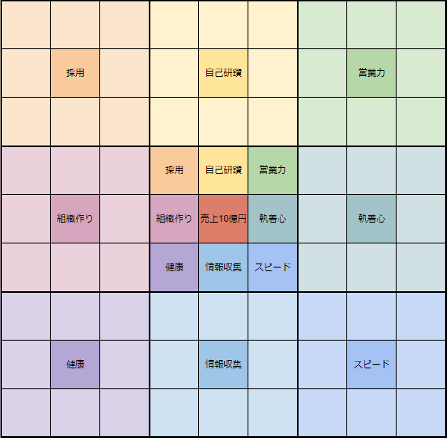 以下のようなイメージで3×3のマンダラートが9つできたら、後はそれぞれのマンダラートを埋めていきます。マンダラートのテンプレートは検索エンジンで検索いただくと無料で提供されているものが出てきます。