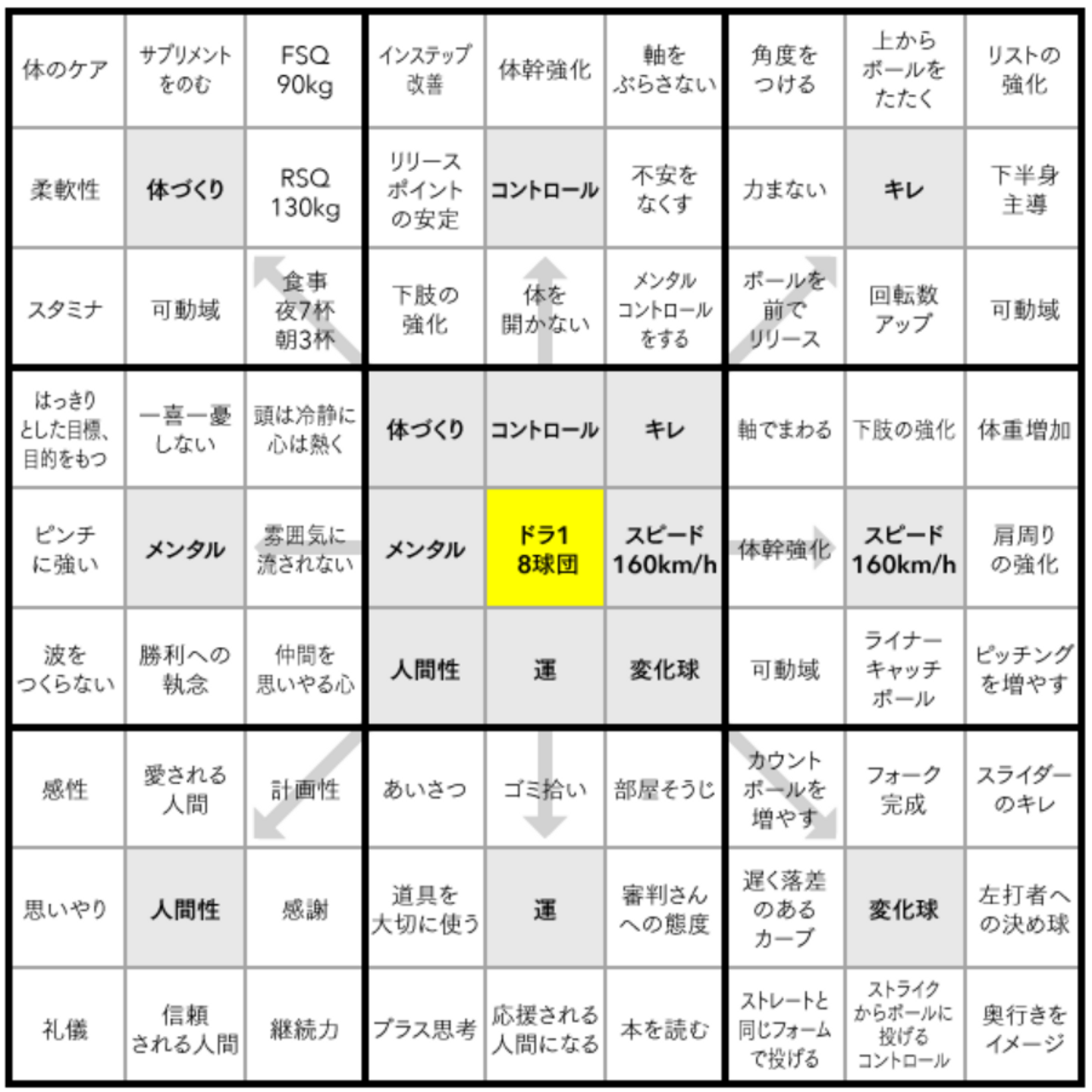 有名な大谷選手のマンダラートは以下ですね。