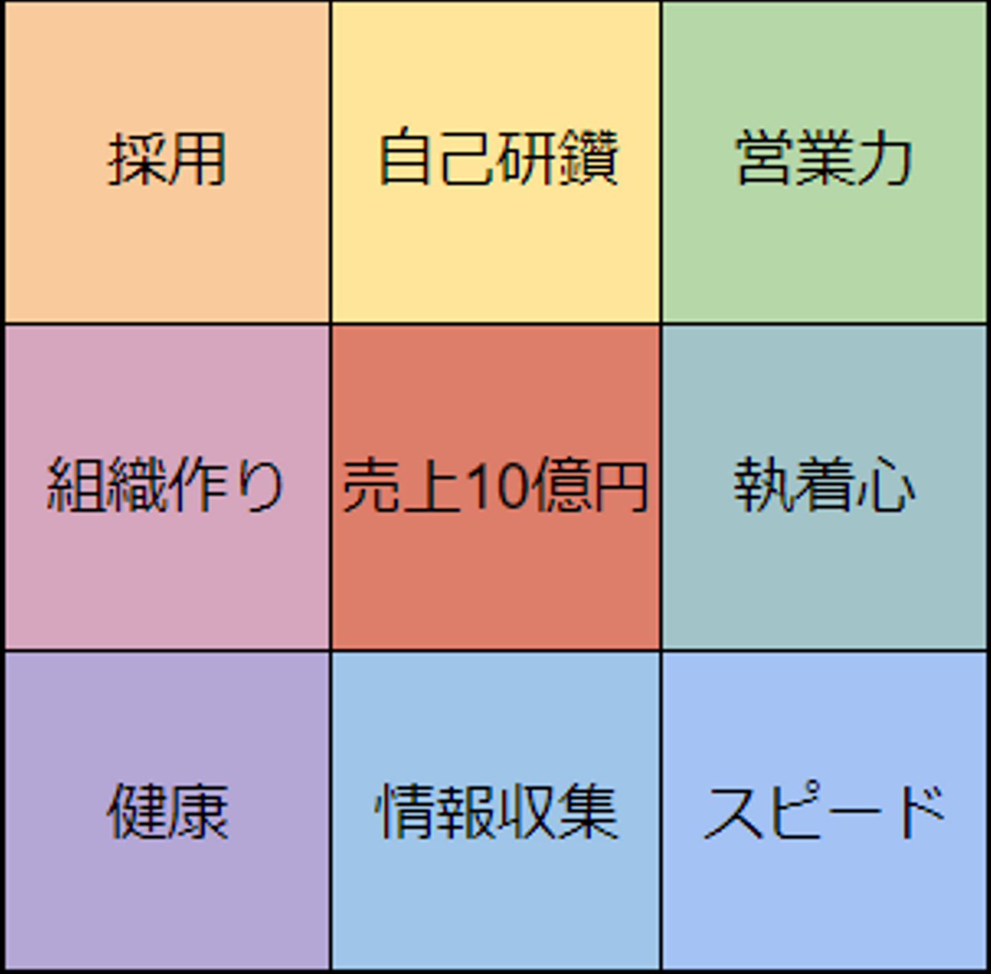 はじめに3×3の9つのマスを書き、その中心に達成したい目標を記載します。そして、周りの8マスに目標を達成するために必要な大きな要素(大項目)を記載します。
