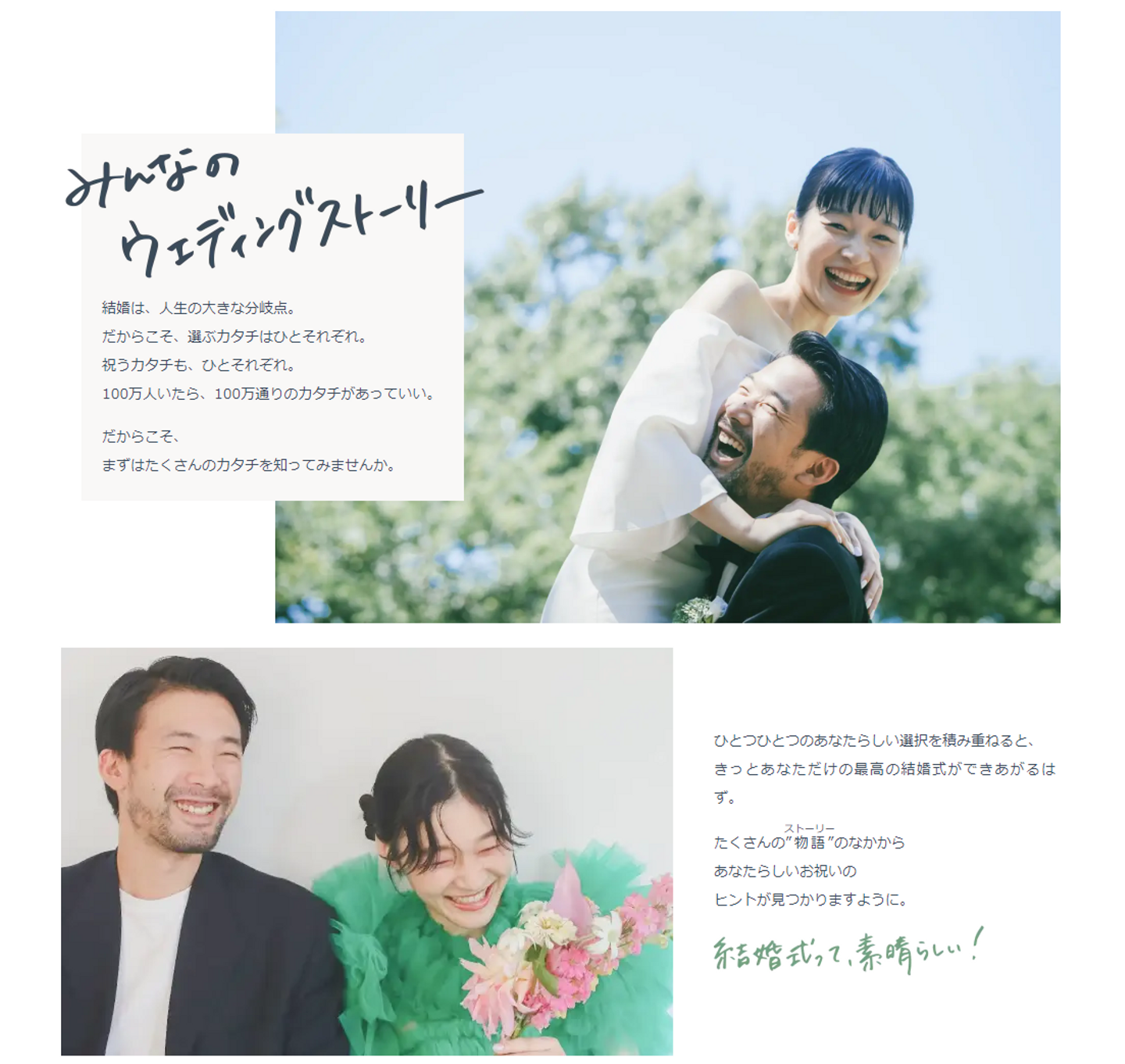 コロナ禍を経て従来の結婚式に捉われない結婚式の新しいカタチが色々と顕在化してきています。今までは、結婚式を挙げるとなると結婚式場探しがメインでしたが、みんなのウェディングストーリーは、新しい結婚式のカタチを知ってもらうことを目的と、様々な事例から結婚式を探せるコンテンツです。