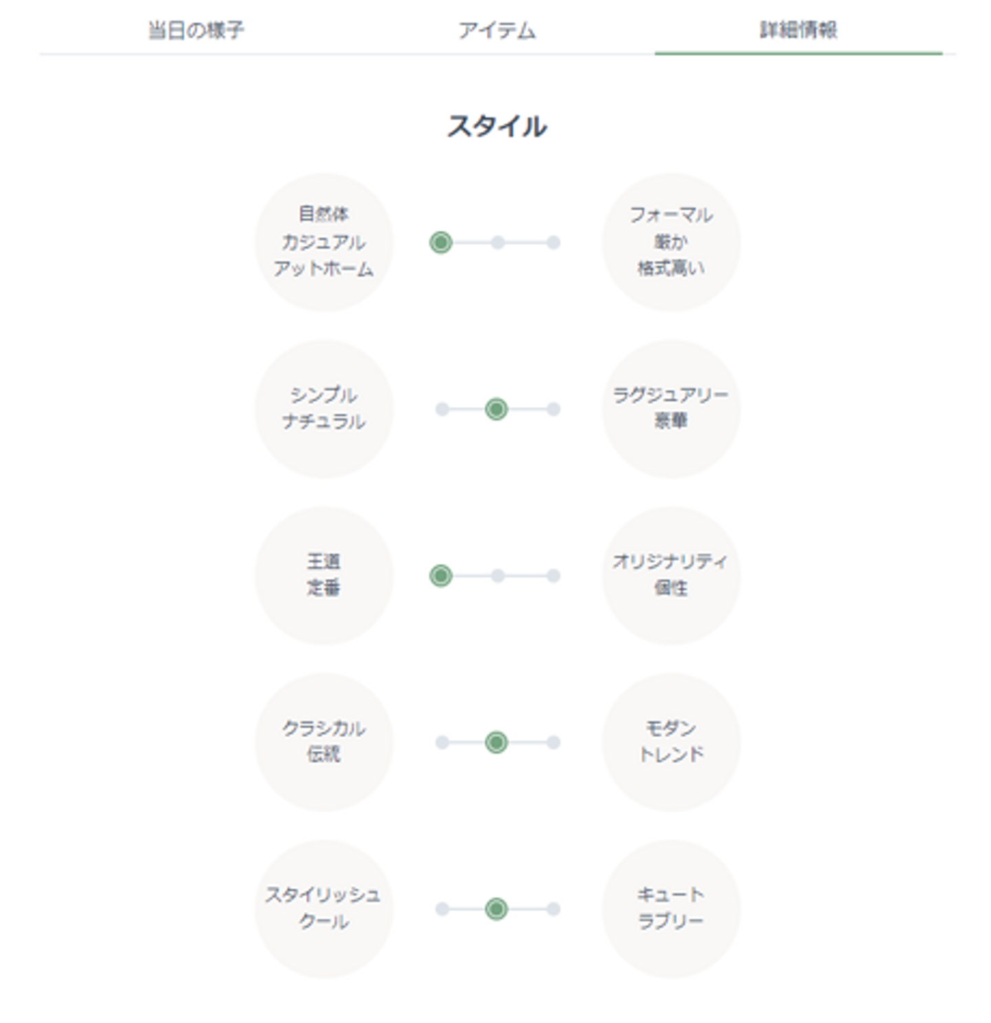更に、自分達が挙げた結婚式のテイストも「ナチュラル ⇔ ラグジュアリー」「アットホーム⇔フォーマル」など、いくつかの項目を設けてどんなテイストを選んだのかも見ることができます。