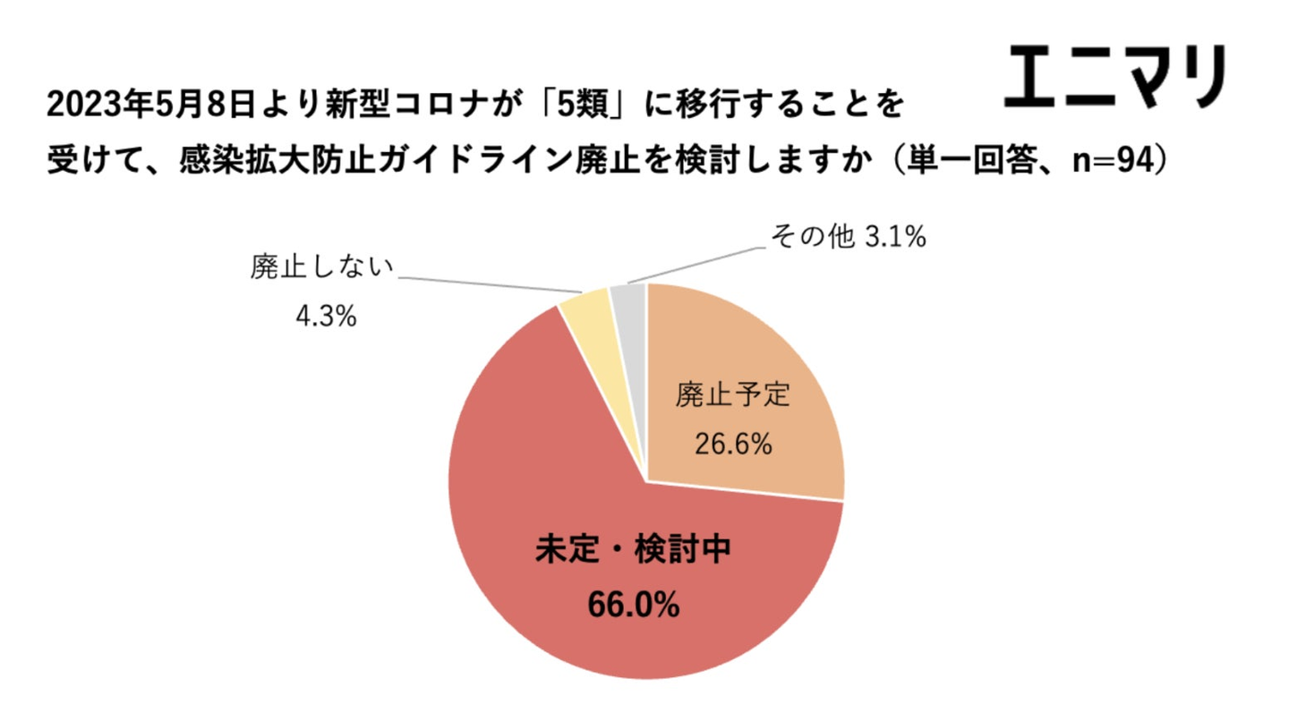 2023年5月8日より新型コロナの感染症法上の位置づけが「5類」に移行することを受けて、各結婚式場が設ける感染拡大防止ガイドラインの廃止を検討するかについて聞いたところ、約7割の結婚式場が「未定・検討中」と回答しました。