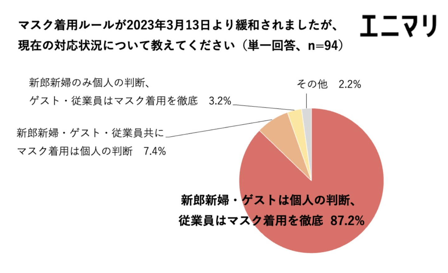 マスク着用緩和から1ヶ月、結婚式場の9割が 「新郎新婦・ゲストは個人の判断、従業員はマスク着用を徹底」