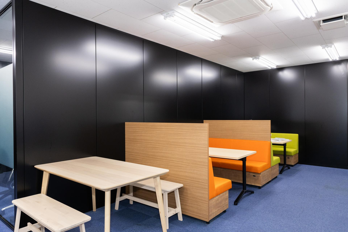みんなに「ファミレス席」と呼ばれているソファ席では、打ち合わせや作業スペースとしても大活躍!