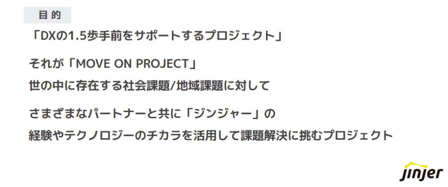 「MOVE ON PROJECT」の取り組み概要について教えてください。 「MOVE ON PROJECT」は、一言で言うと 「DXの1.5歩手前をサポートすること」 を目的におこなっているプロジェクトです。