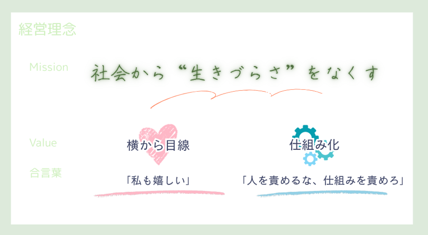 代表からは改めて、経営理念である「社会から生きづらさをなくす」についてお話しいただきました。