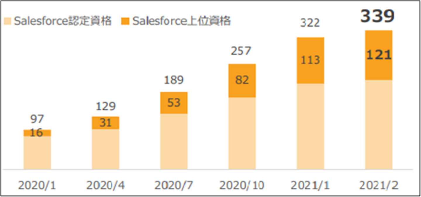 この賞は、2021年度(2020年2月~2021年1月)にセールスフォース・ドットコムがDXアクセラレーションプログラムで注力されている上位資格(コンサル系資格)について、取得数と増加率を基準に最もリソース拡大に貢献したパートナーが受賞することのできる賞です。セールスフォース・ドットコムのパートナープログラムに参加している国内500社以上のパートナー企業の中から選出されています。