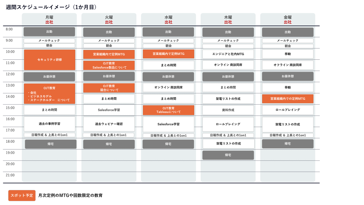 まず入社初月のスケジュールイメージです。