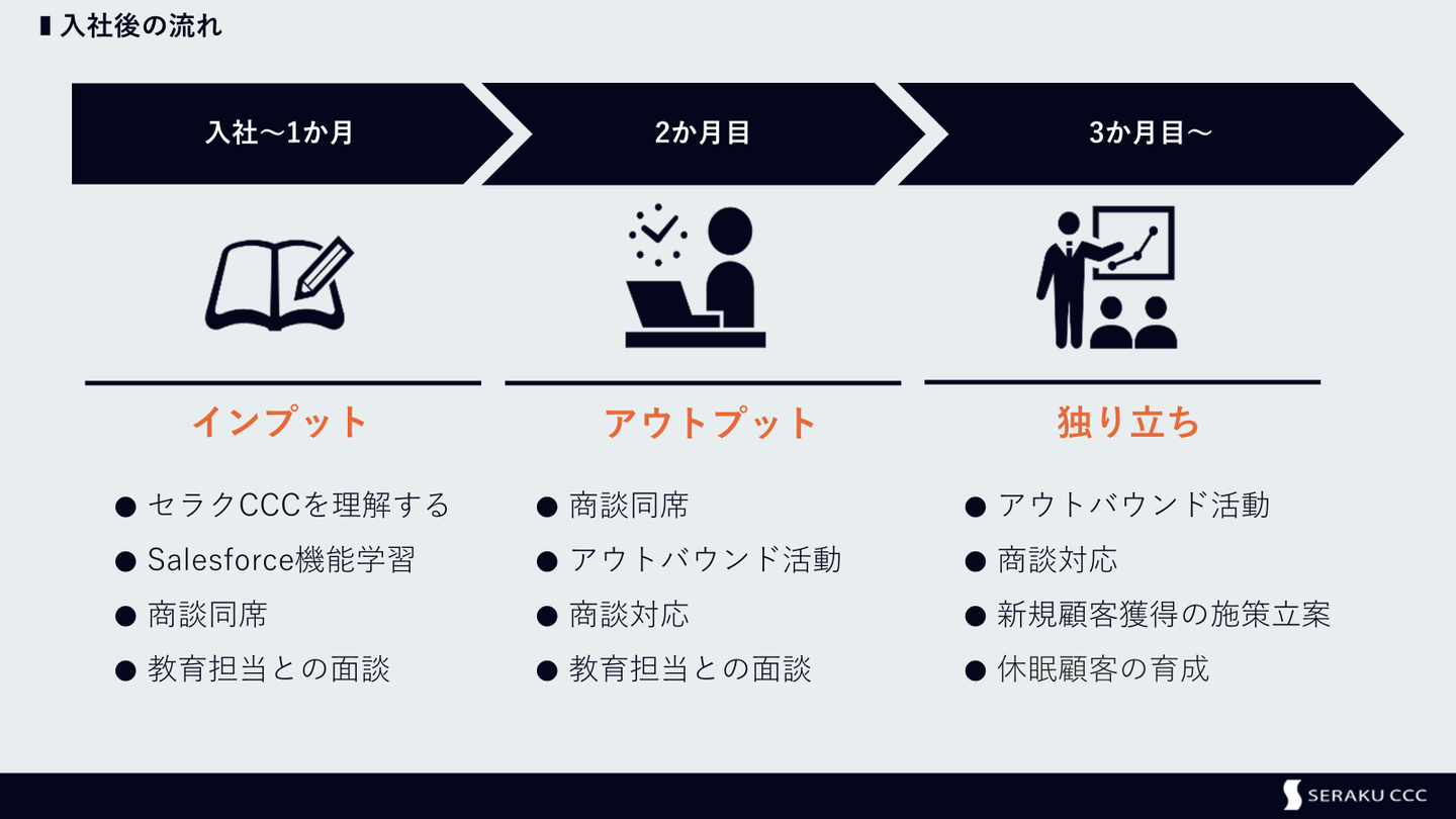 セラクCCCの営業職はOJT形式でクラウドシステムに関する知識や営業スキルの向上を目指していきます。入社から1か月間はインプット期間、2か月後にはアウトプット期間、3か月目には独り立ちができるよう教育担当や周りの営業メンバーからノウハウを吸収し、スピーディーにお客様にアクションをしていく必要があります。