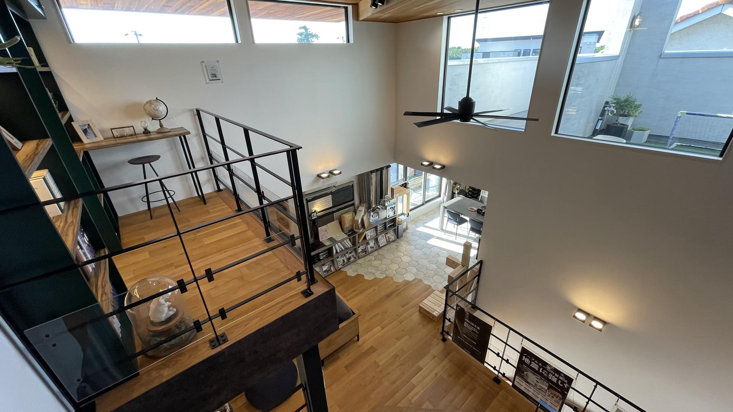 構造計算しながら建築をしていくメリットとして,下図のような大きな吹き抜けを住宅でも取り入れることができます。ある程度開口部分が大きくなってしまうと,この部分で梁がむき出しになったり(デザインとして取り入れることもある),鋼製ブレースを入れなければならなかったり,木造ではなく鉄骨造で設計するなどの対処が必要になる場合があります。弊社では鉄骨造とほぼ同じ構造計算(ルート2)を行うことが可能であるので,お客様のニーズにより柔軟な対応が可能であります。