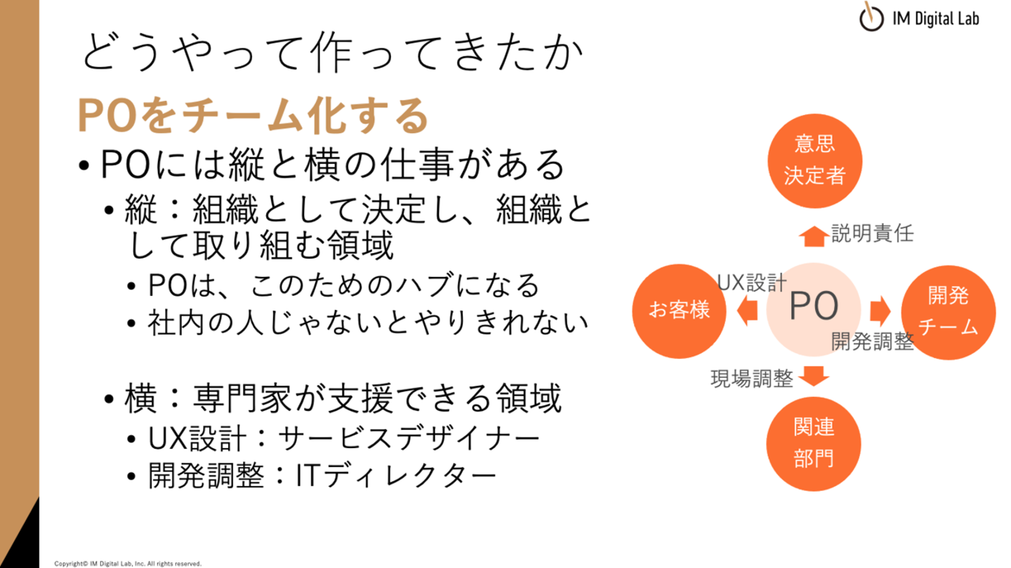 スクラムガイドでは『プロダクトオーナーは1人の人間であり、委員会ではない』と書かれています。その通りではあるのですが、POに全ての権限を移譲することは難しいです。そこで三越伊勢丹では「POは組織的な意思決定を導くためのハブとなる」という考え方にしています。