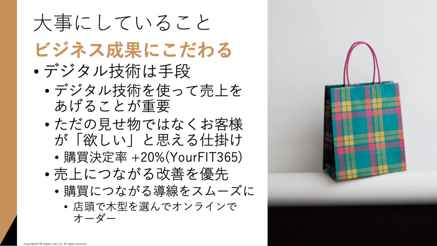講演では、アイムデジタルラボが開発してきたYourFIT 365と三越伊勢丹リモートショッピングについて、アジャイルを活用しながら、どのような考え方や姿勢で三越伊勢丹のDXに取り組んできたか、について説明しました。