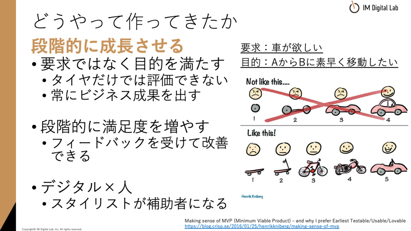 例えば「車が欲しい」という要求から始めてしまうと、最初に提供される部分はタイヤになります。タイヤだけが提供されても顧客は満足せず、結局は最後に車ができるまで不満を持ち続けます。途中でフィードバックをすることもできません。そうではなくて「AからBに素早く移動したい」という目的から始めましょう。それなら最初に提供するのはスケボーでも良くなります。もちろん、全員を満足させることはできませんが、特定の状況にいるユーザーはスケボーを利用し、なんらかのフィードバックをくれます。このフィードバックに従い、改善を続けながら、だんだんと満足度をあげいくのです。「こういう機能が欲しい」という要求ではなく、その機能が提供する目的に対して満足度を増やしていくことでフィードバックによる改善が可能になるのです。