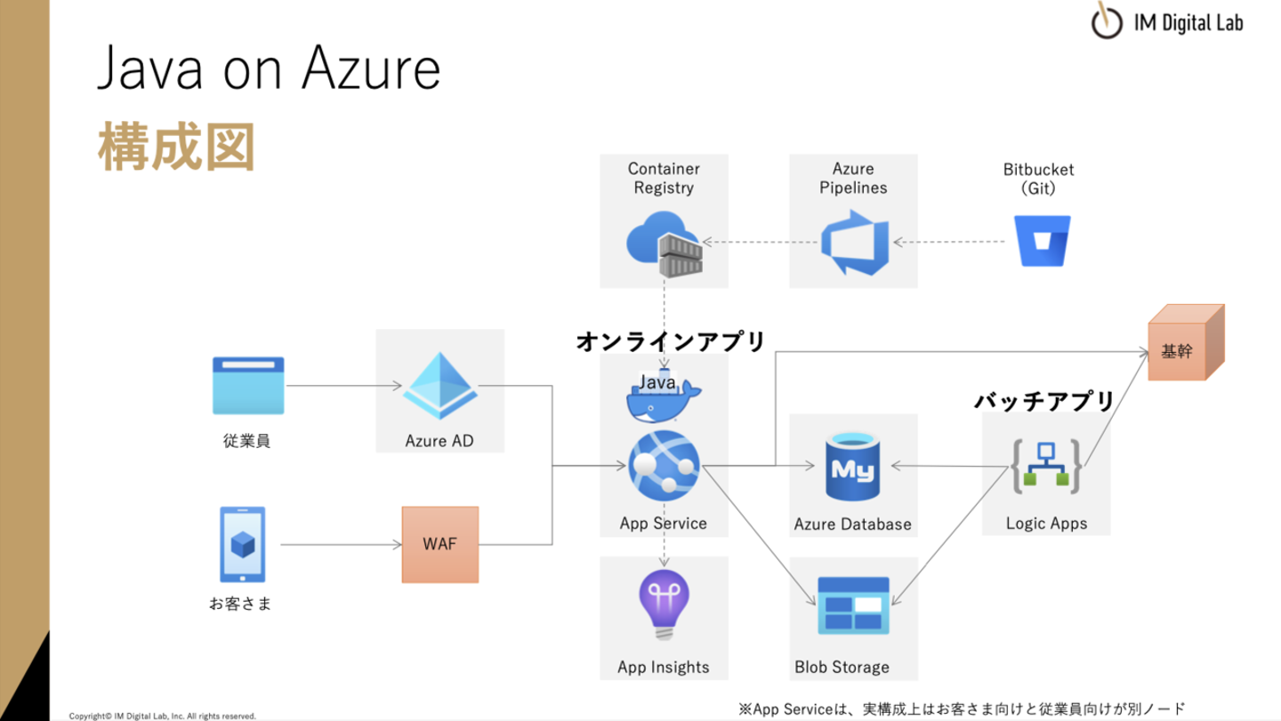 具体的には以下のような構成です。オンラインアプリケーションはApp Service上のDockerコンテナで動いています。従業員からのアクセスされるノードはAzure ADで保護されており、お客さまからアクセスされるノードはWAFで保護されます。バッチアプリケーションはLogic Appsで構築しました。その他、APMとしてApp Insights、CI/CDツールとしてAzure Pipelinesを利用しています。それぞれのコンポーネントの長所や短所については資料をご覧ください。