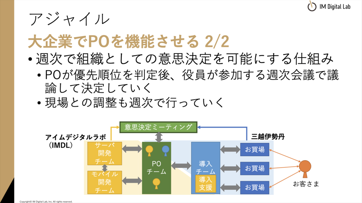 こうしたデジタルサービスの実現には「やってみて、お客さまからのフィードバックを得て改善する」というプロセスが必要になります。そこでスクラムを採用しています。ただし、三越伊勢丹のような大企業ではスクラムガイドに書かれていることだけではうまくいきません。そこでプロダクトオーナー(PO)を機能させるために、2つのことに取り組みました。