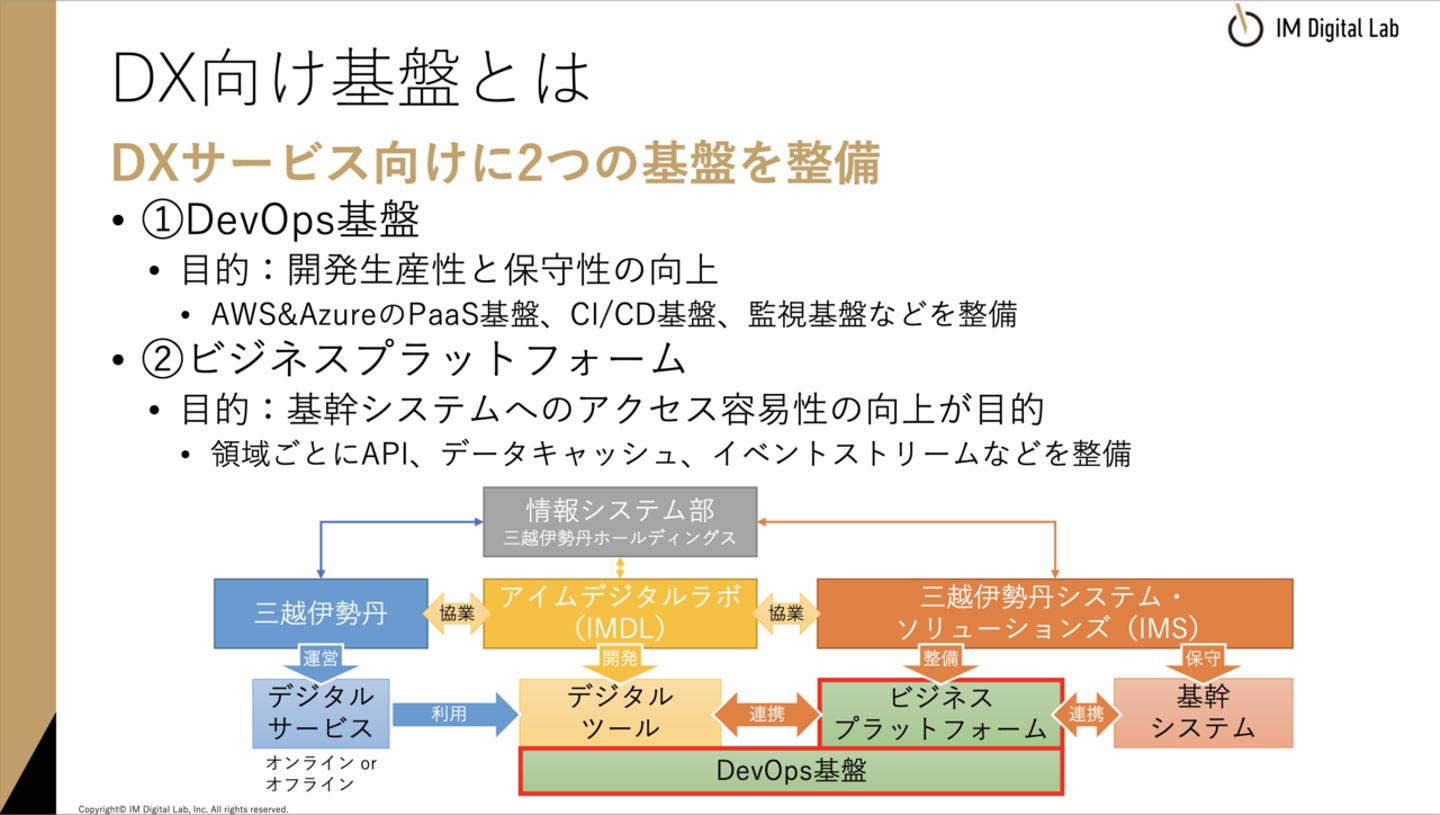DX向け基盤としてはアジャイル開発基盤であるDevOps基盤と、基幹システムへのデータハブとなるビジネスプラットフォームの2階層を整備しています。