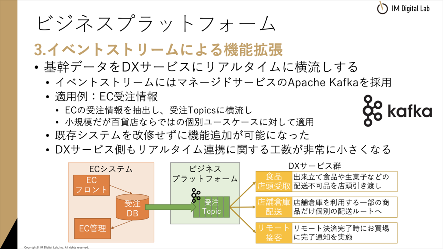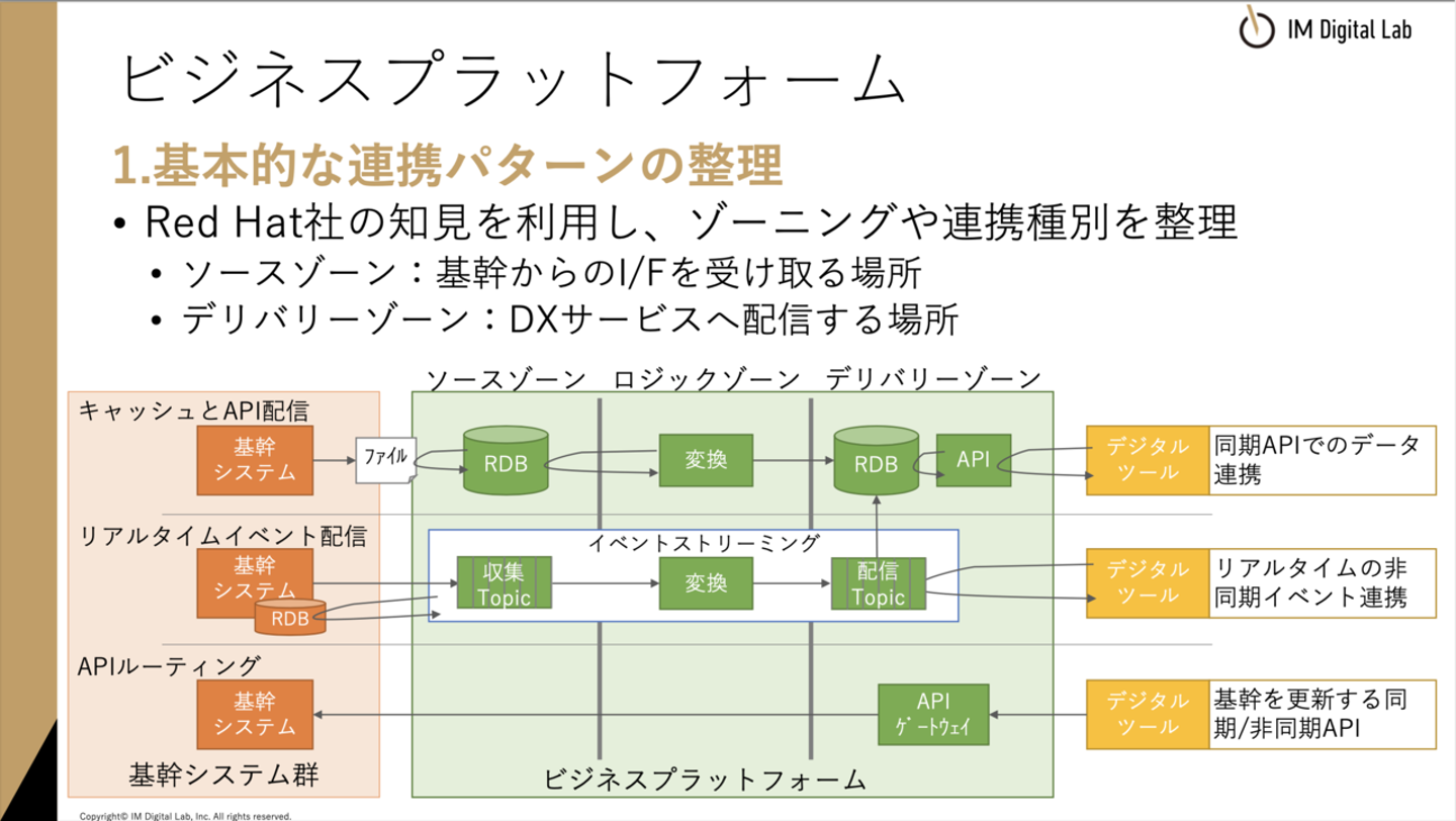 一方、ビジネスプラットフォームは、DXサービスのために基幹システムのデータをAPIやイベントストリームとして提供する基盤です。