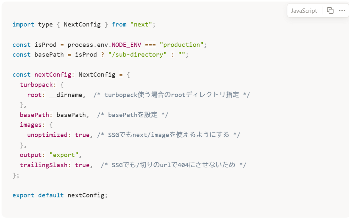 まず、next.config.ts にて定数 basePath を定義して、値に productionビルドの時にサブディレクトリが入るようにします。そしてその定数 basePath を nextConfig の basePath として設定します。 ※該当箇所以外の要素や値は一例です。各環境に合わせて変更してください。