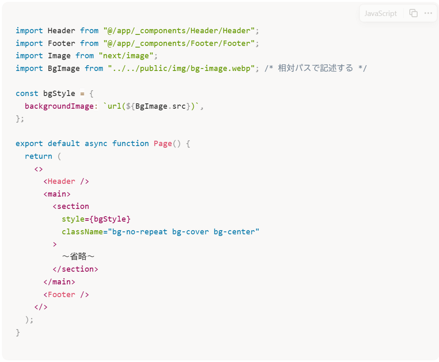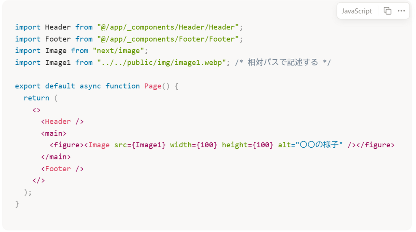 Imageコンポーネントのsrc属性のパスは以下のようになります。Imageコンポーネントを使わずimg要素を使う場合も同じです。 ※該当箇所以外の要素や値は一例です。各環境に合わせて変更してください。