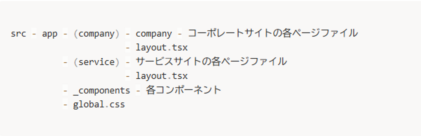 最初は普通に1つのサイトとして作って /company/ 配下だけ違うコンポーネントを読み込んでデザインを変えようと思っていました。でも、進めようとしたところいきなり問題が出てきました。どういう問題かと言うと、body に背景色やフォントのスタイル当てたいけど、body は共通の app 直下の layout.tsx で管理されているというものです。できるだけ共通部分はシンプルに管理したい。そうすると各 page.tsx でスタイルを分けるための記述が増える。美しくない。
