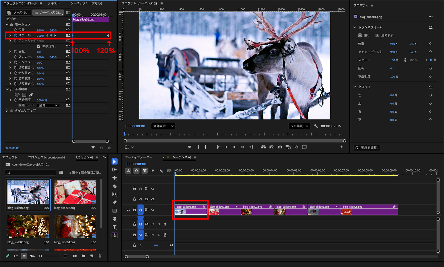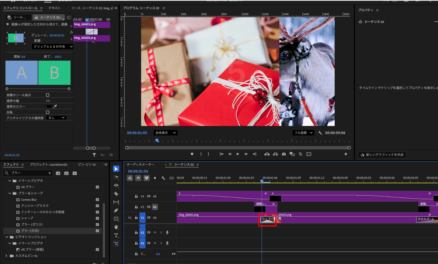 これらのエフェクトを、各画像のつなぎ目(「5〜4」「4〜3」「3〜2」「2〜1」「1〜0」)に配置すれば完成です。