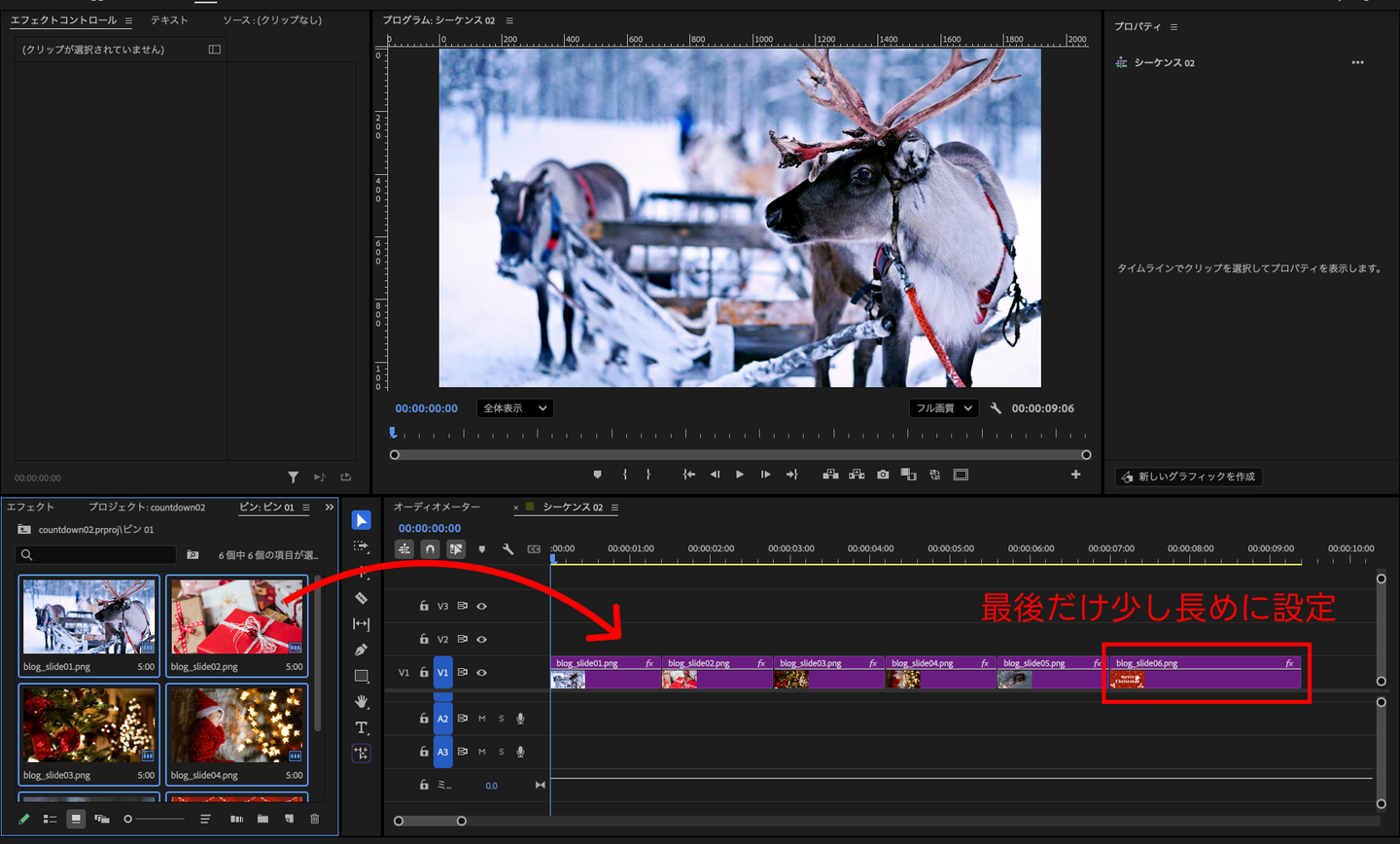 画像が揃ったら、Premiere Pro のシーケンスにドラッグして並べます。 「5~1」にあたる画像は同じ長さに揃え、「0」の画像は余韻を持たせるため少し長めに設定しています。
