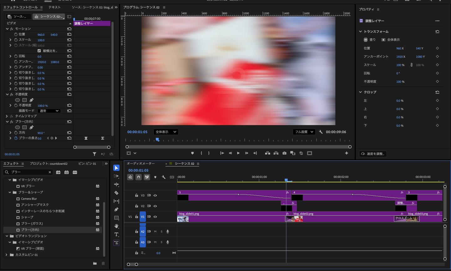 次に、画像と画像の切り替わり部分に疾走感を出すため、調整レイヤー+方向ブラーを使用します。
