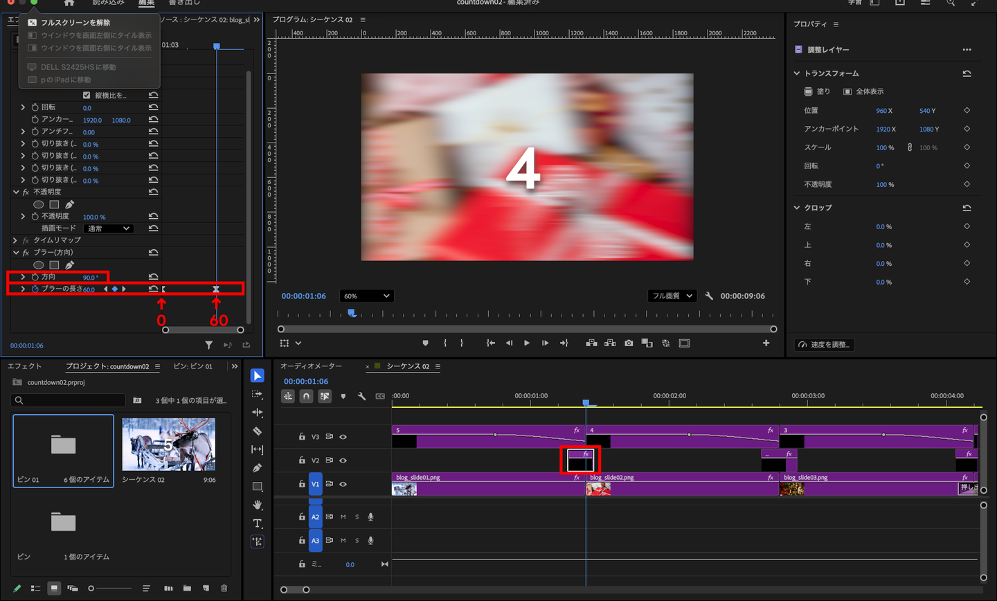 この調整レイヤーを「5〜4」「4〜3」「3〜2」「2〜1」「1〜0」の間に配置することで、切り替えがより勢いのある演出になります。