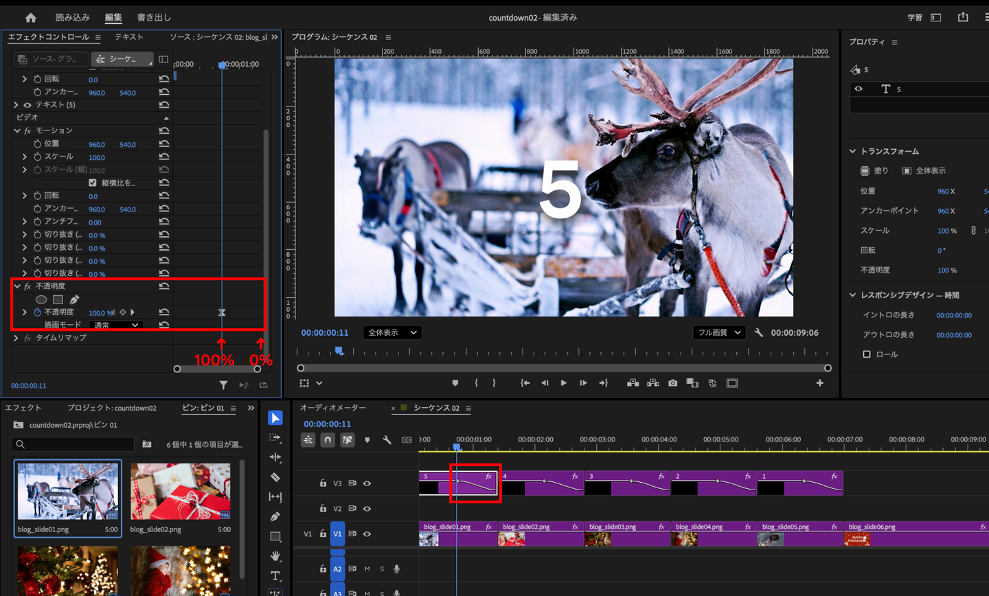 さらに、数字が次の画像に切り替わるタイミングで自然に消えるよう、テキストの不透明度にもキーフレームを設定します。