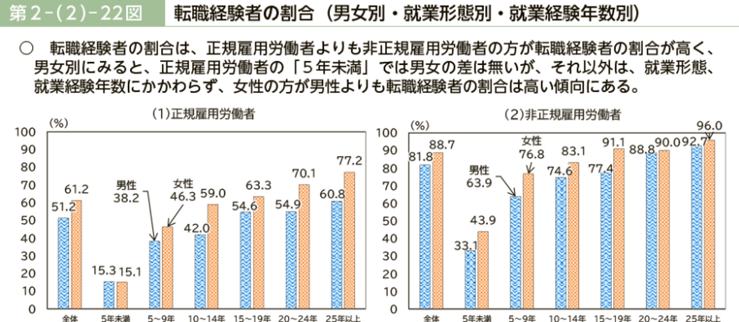 こちらは、日本の転職経験者の割合を示したグラフで、勤務年数が増えるほど転職経験率は増加し、10年ほど職務経歴がある正規雇用者はおよそ半数が転職したことがあると分かります。