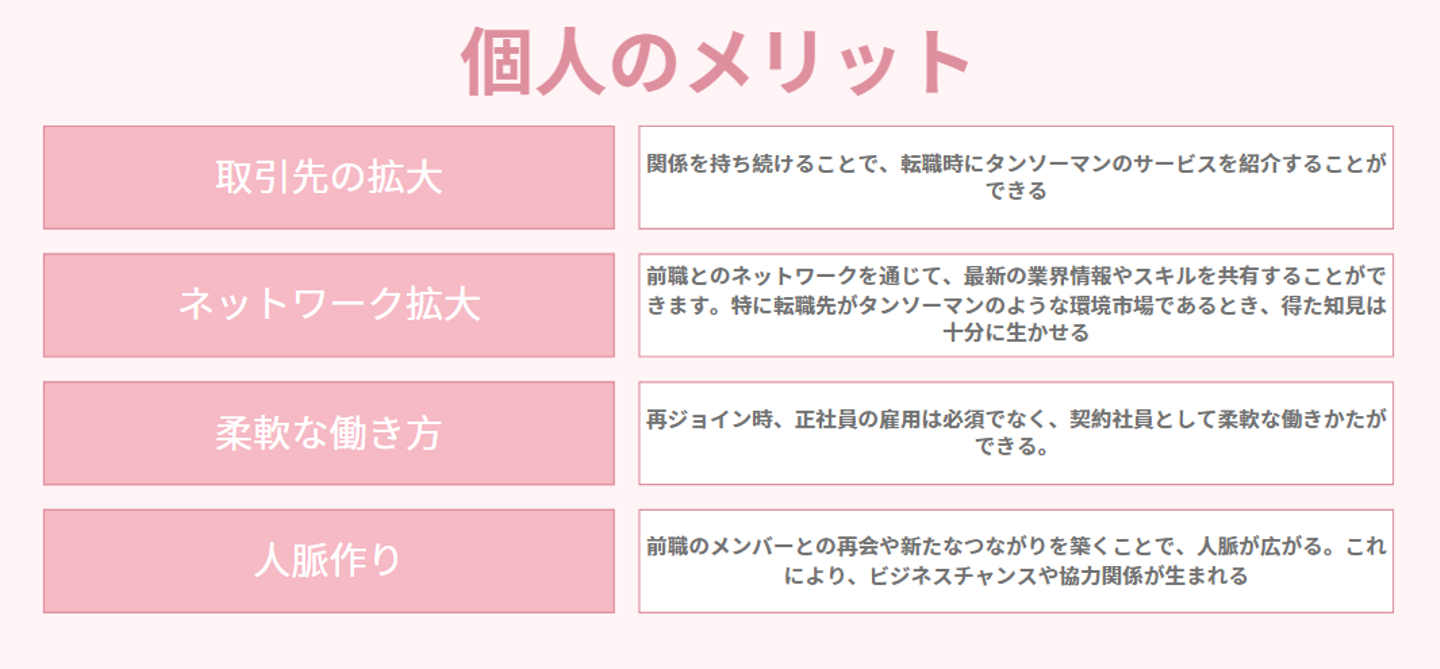 しかし、タンソーマンでは「どうすれば退職した後もメンバーとよい関係を構築できるか?」を考え、その結果アルムナイの制度が非常にマッチしているという結論に至りました。