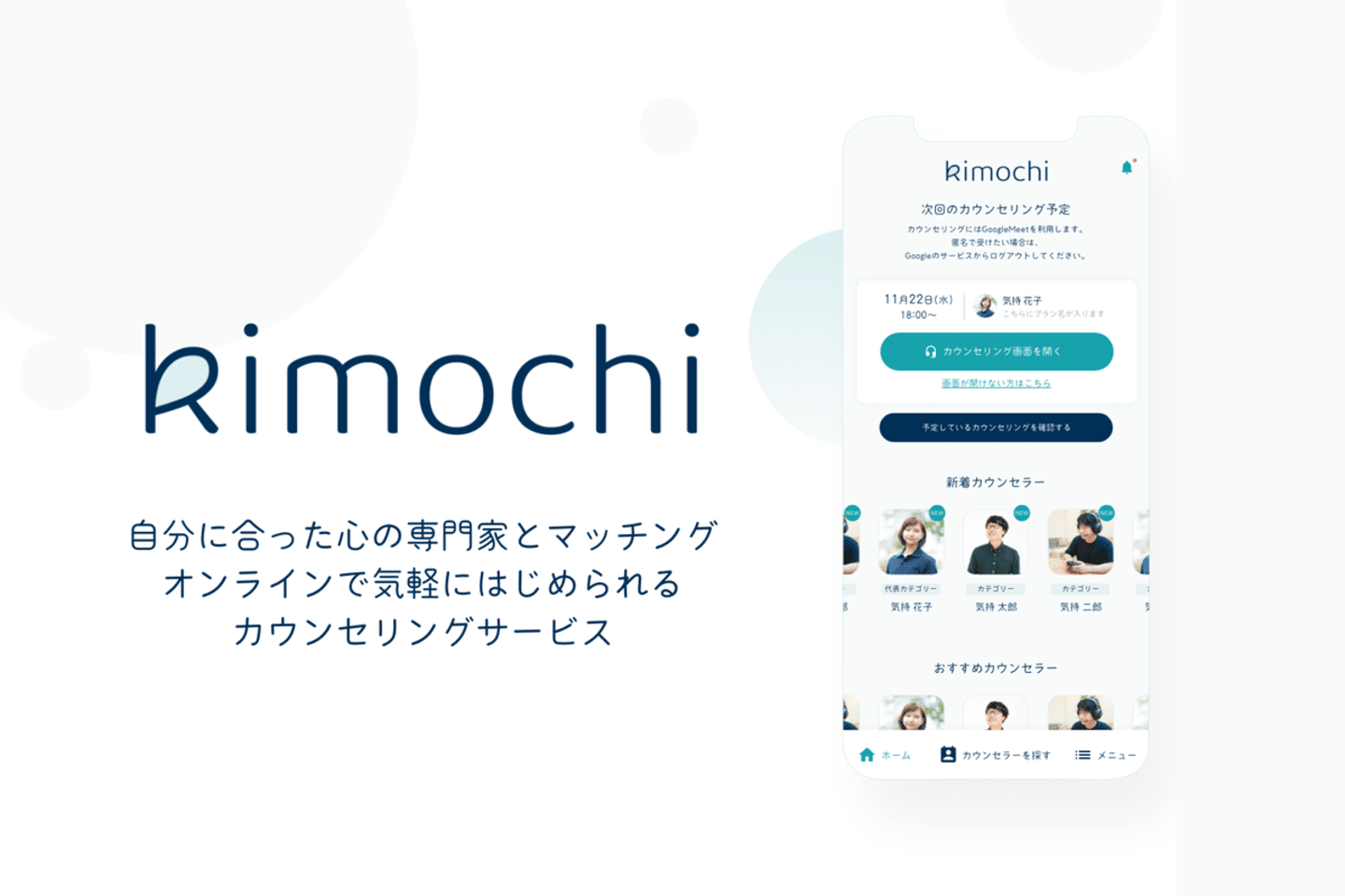今回のプロジェクトでEngineerforceさんにご依頼させていただいたのがオンラインカウンセリング『Kimochi』というプラットフォームで、公認心理師の資格をもったカウンセラーとオンラインでマッチングをしてカウンセリングを受けられたり、感情分析や性格診断などもできるプラットフォームになっております。