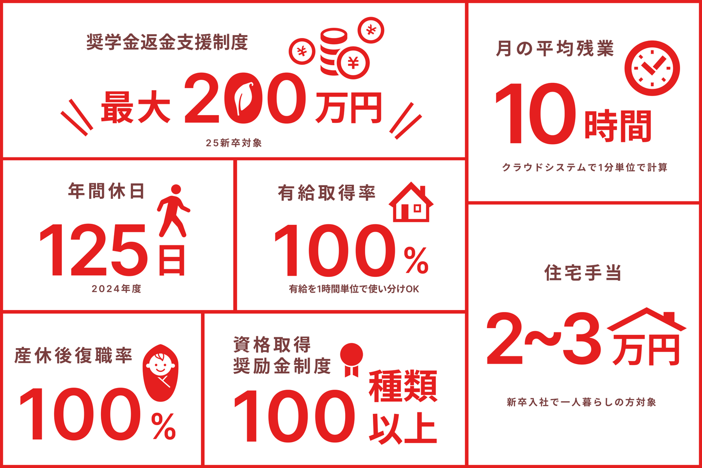 その他にも、・財形貯蓄制度や持株会制度・年次有給休暇の一人当たりの取得日数平均が13日/年(2023年度実績)・女性の育児休業取得率100%(2023年度実績)
