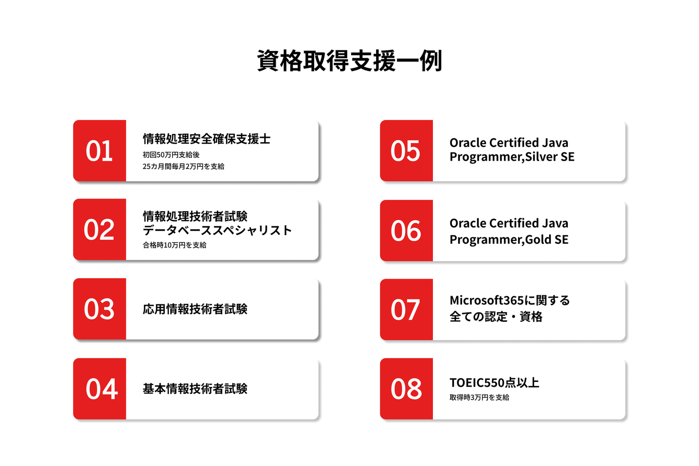 資格取得の奨励金はモチベーションになるのではないかと思います。最近では幅も広がり、100種類以上の資格が奨励金の対象になっています。メーカー系の資格や、ITパスポートといった基礎的な技術系の資格まで様々な資格が対象になっていますし、資格取得の際の参考書購入、資格取得費用は会社負担になります。