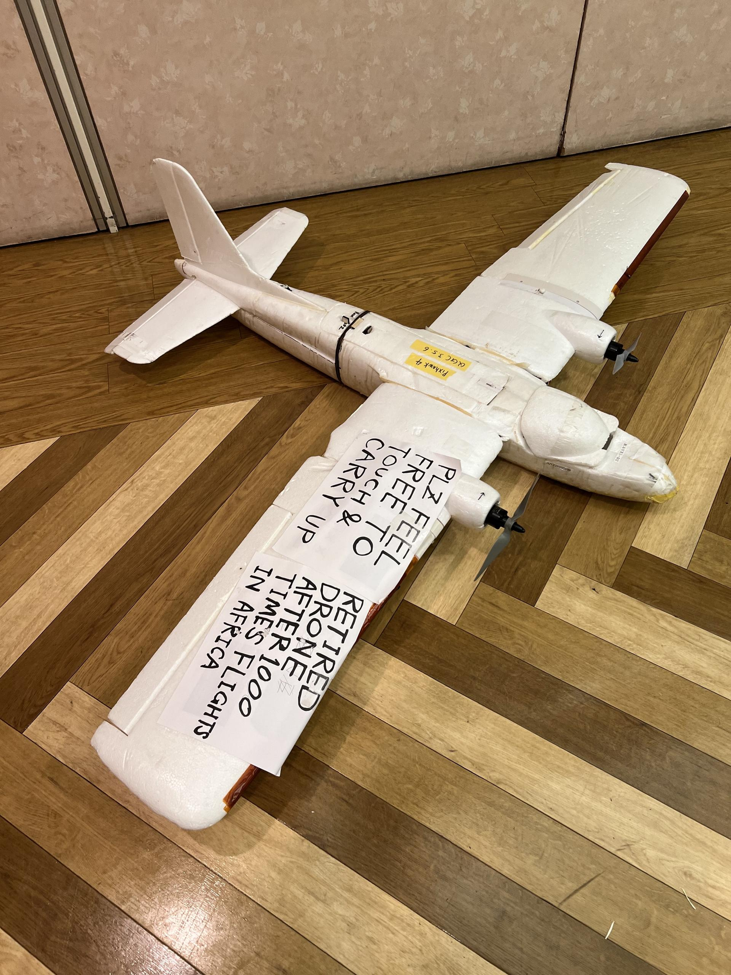 こちらはシエラレオネやガーナで飛ばしたドローン。発泡スチロールでできた機体は簡易ですが、組み立てやすいという利点があります。長時間の飛行を終えて、この合宿を持って退役します。