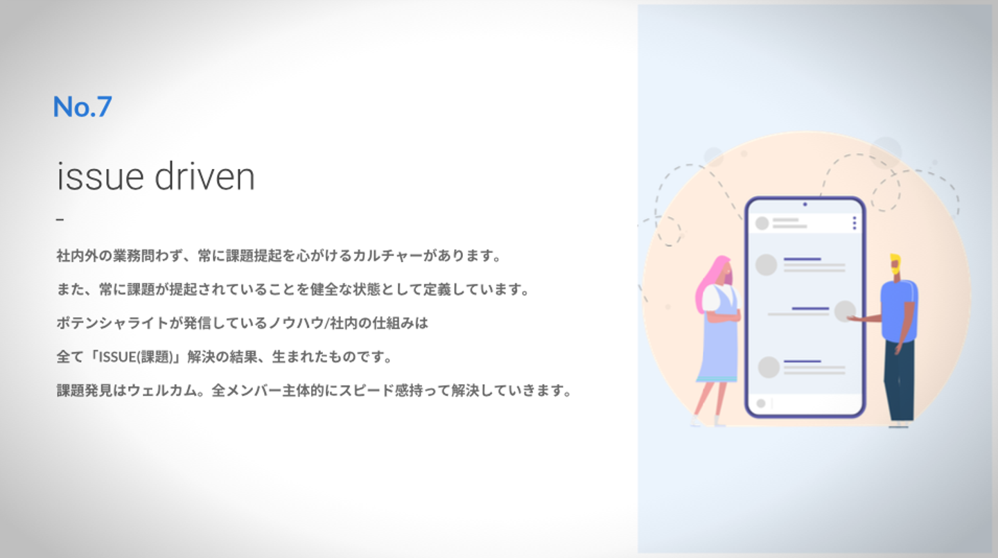 現在、ポテンシャライトでは、当社で策定している10個の「カルチャー」をリレー形式で発信しています。今回は、第9弾となる「issue driven」についてご紹介いたします。