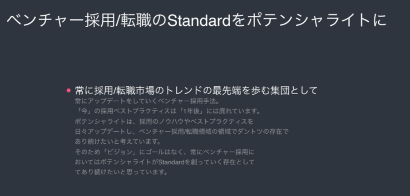 上図の通り、当社は、「ベンチャー採用/転職のStandardをポテンシャライトに」をビジョンに掲げています。具体的には、採用のノウハウやベストプラクティスを日々アップデートし、採用/転職市場のトレンドの最先端を歩む集団でありたいと考えています。