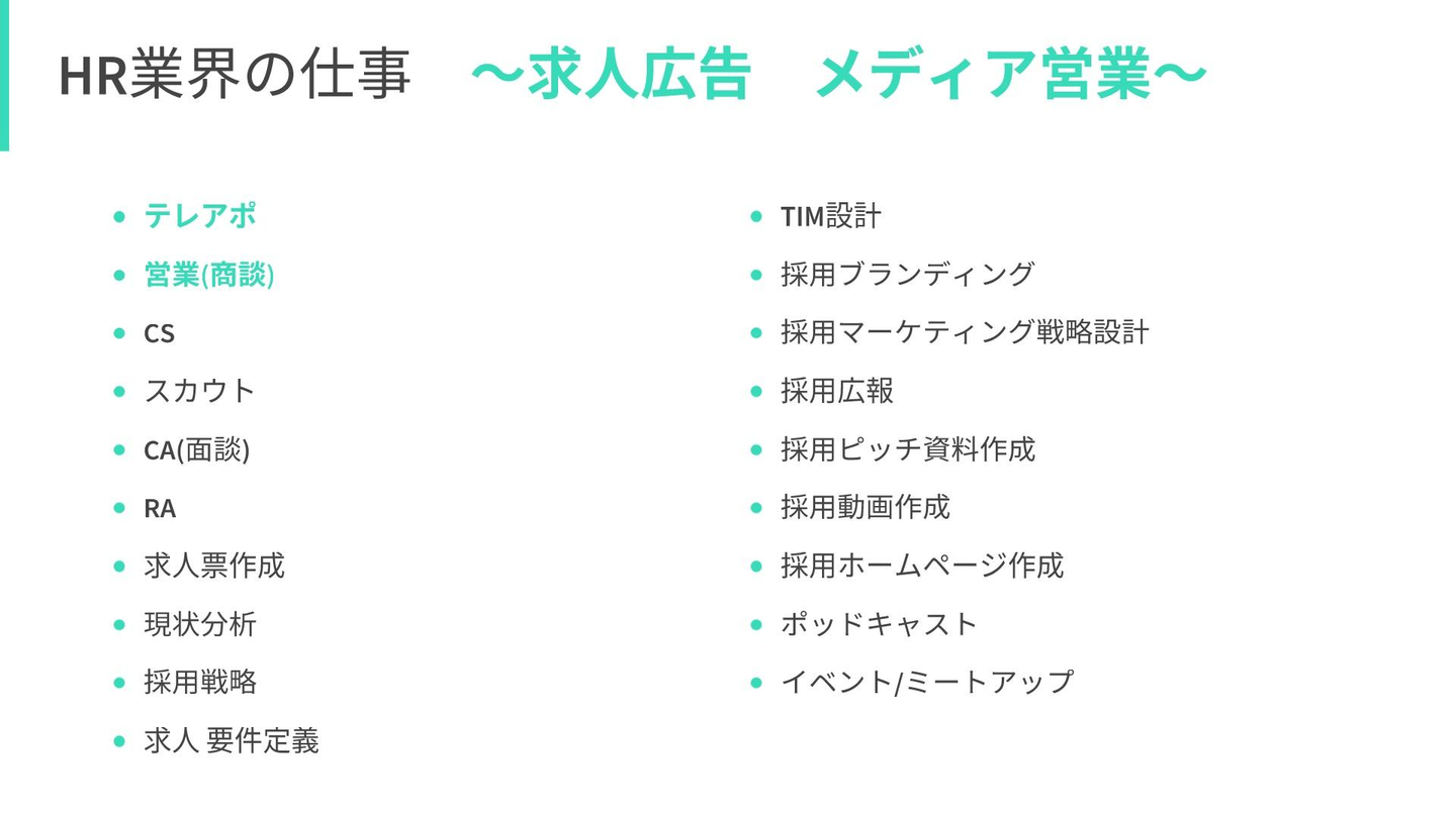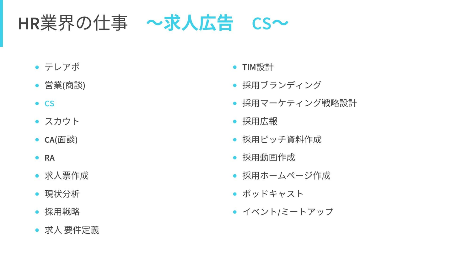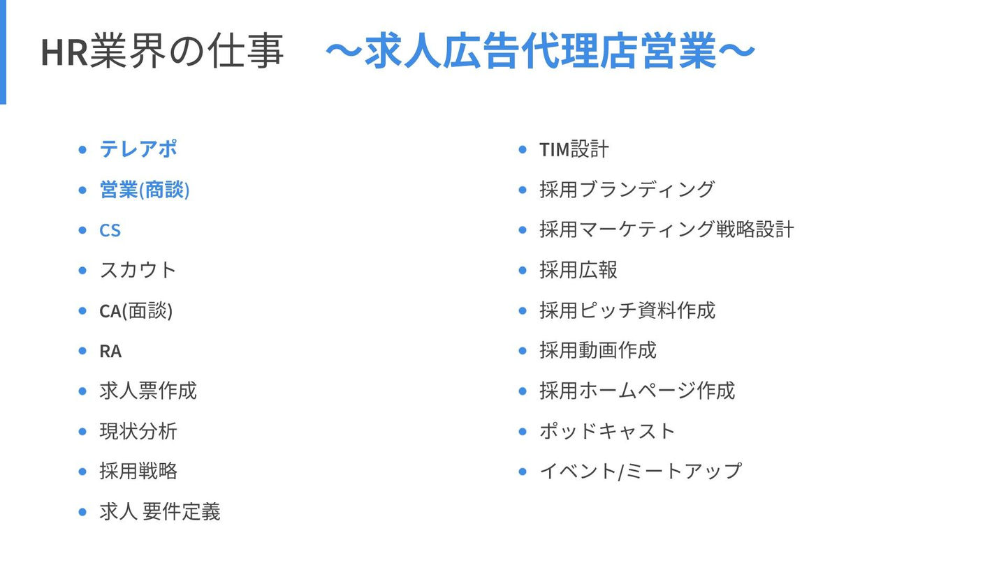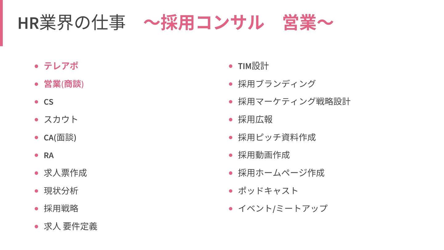 まず前提として、HR業界にはさまざまな職務内容が存在します。少し見てみましょう。