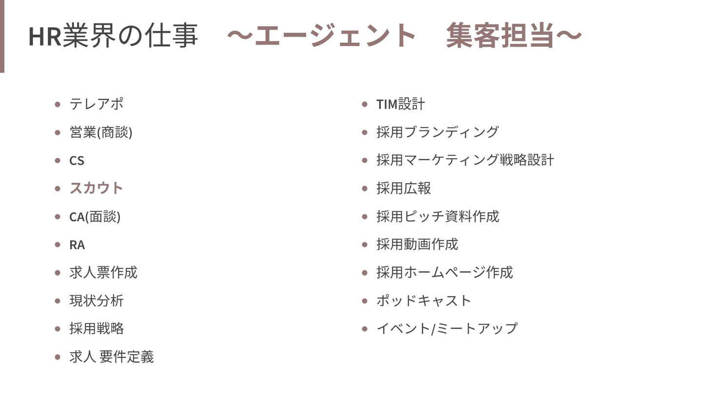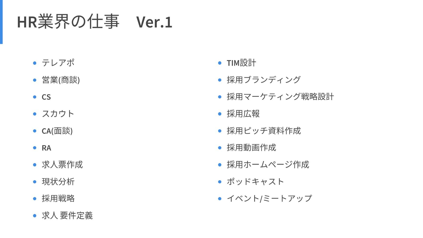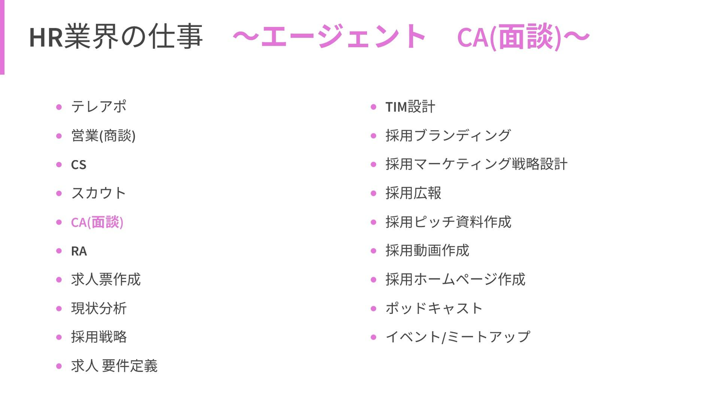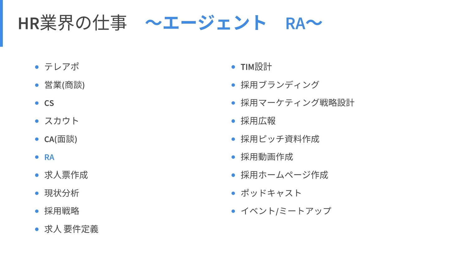 まず前提として、HR業界にはさまざまな職務内容が存在します。少し見てみましょう。