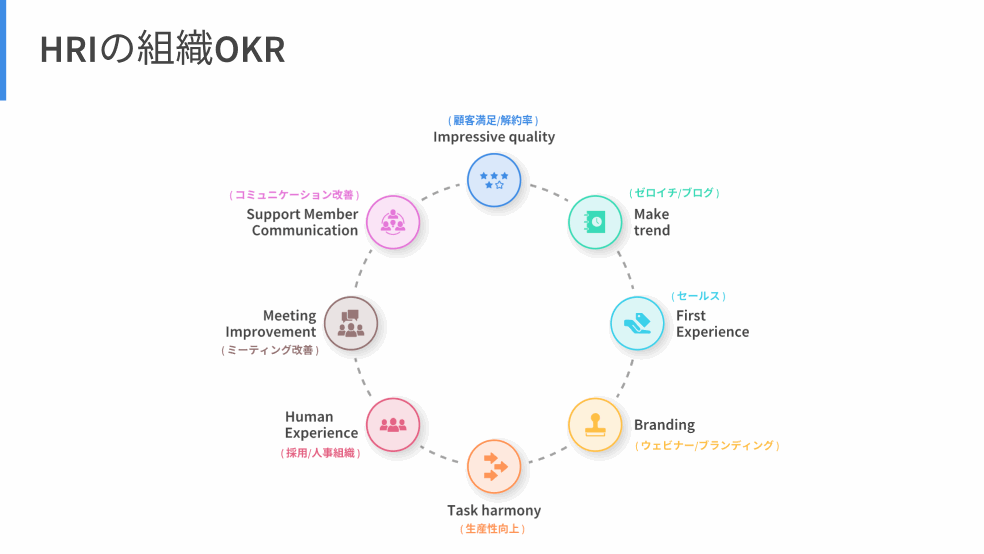 HRインキュベート事業部の組織OKRは8つに分類しておりまして、上記の項目にそれぞれリーダーを一人ずつ据えて、組織がより良い方向に向かうようプロジェクト化して動いています。3ヶ月ごとに担当者の変更機会も設けているため、誰が何のOKRを担当するかは期間によって異なるため、飽きがこないですし、短期で集中できるようにしています。