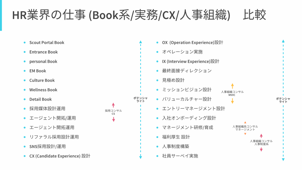 前項で一般的なHR界隈での仕事内容を業種/職種別に比較してみました。それと同時にポテンシャライトの仕事内容も比較してみたのですが、当社の職務内容の「独自性」はご理解いただけたのではないかなと思います。