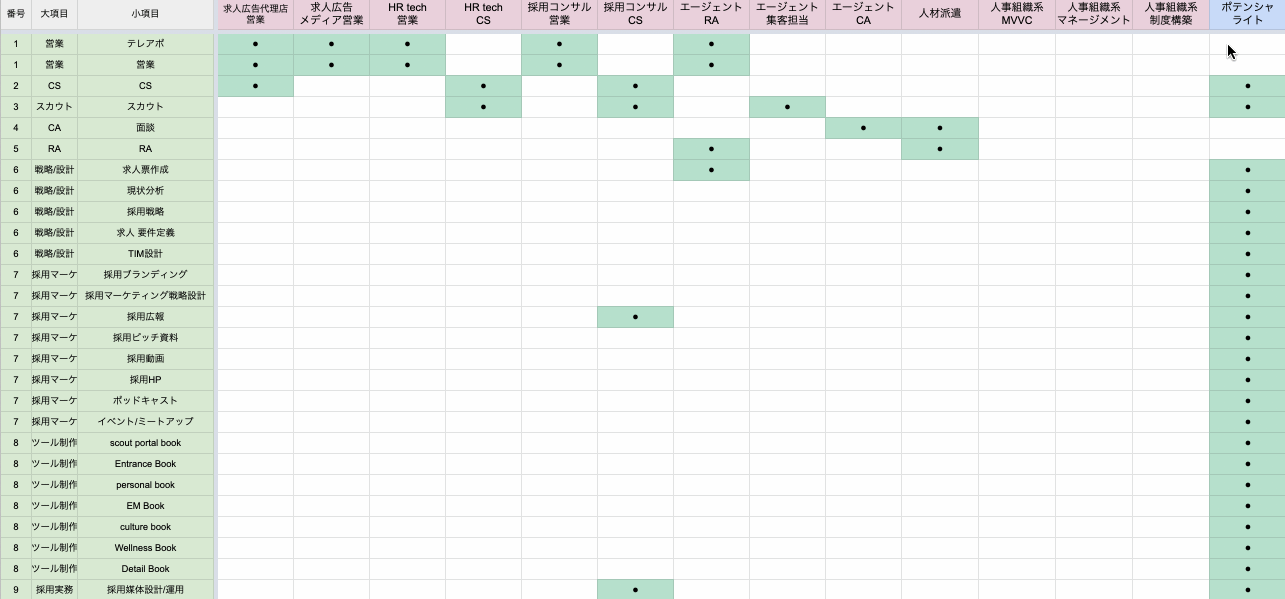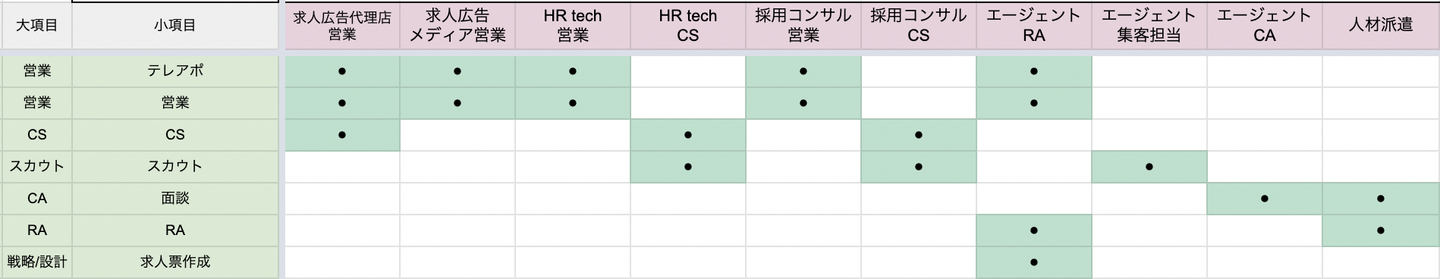 上記の職務内容を、前項で記載をした「業種/職種ごと」に該当箇所を羅列していきます。