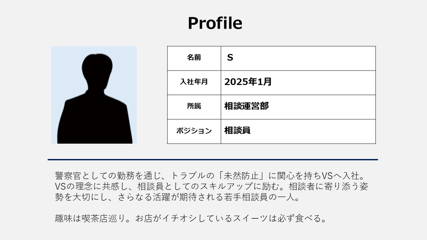 Sさん: VSにいる相談員は全員元警察官ですが、「元警察官だからすぐできるはず」という考えは一度捨てて、素直な気持ちで学んでいくことが大事だと思います。民間企業ですし、仕事内容も全くの別物なので。あと、人に寄り添い、人を助けたいという熱い想いをここまで体現している企業は、日本中でVSが1番なのではと思います。これから入社される方々とも一緒に、安心・安全に暮らせる社会を作っていきたいです。