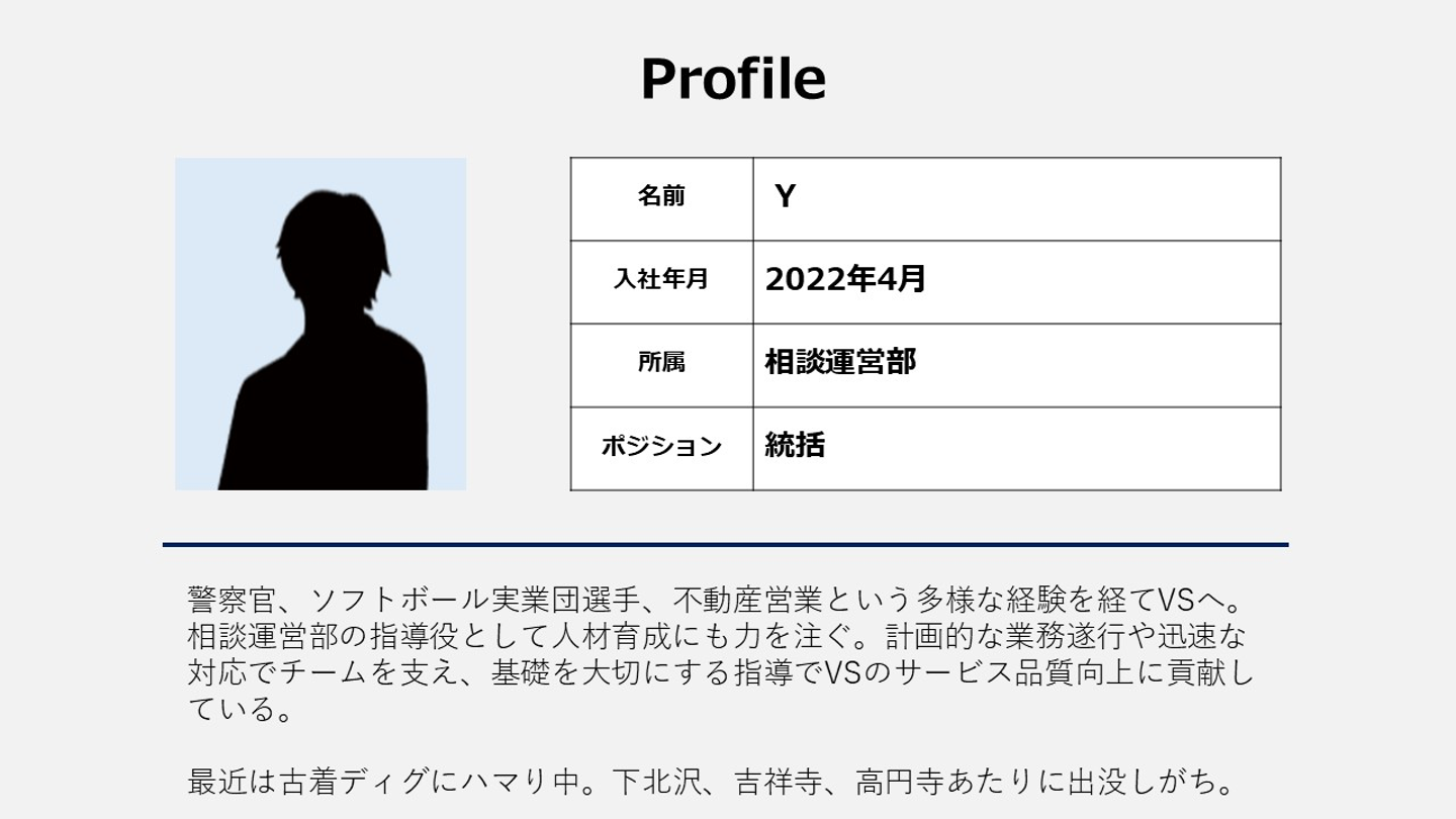 ー まずはお二人がヴァンガードスミス(以下、VS)に入社された経緯から教えてください。Yさんは元警察官から不動産営業を経てVSへ、というユニークな経歴をお持ちですが、詳しくお聞かせいただけますか?
